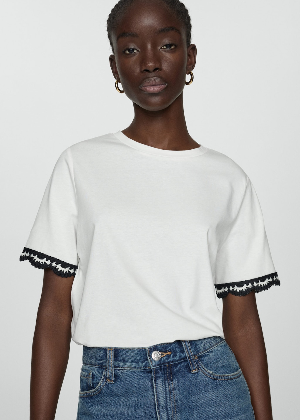 A cute crochet trim upgrades a plain white t-shirt.